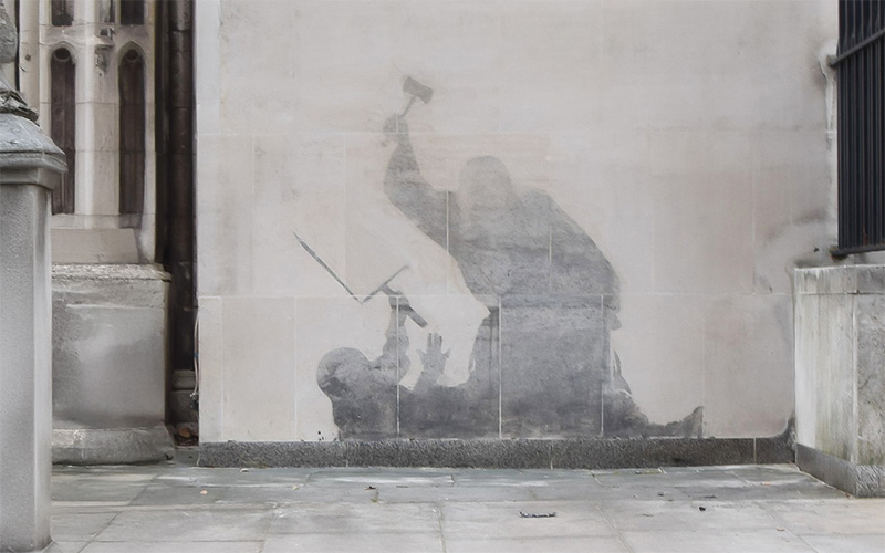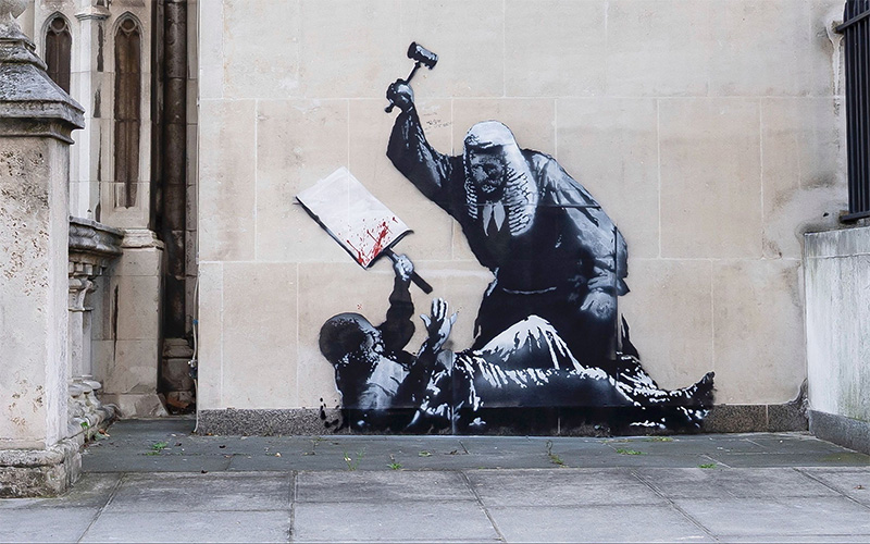 8 września 2025 roku Banksy stworzył nowy mural na fasadzie londyńskiego Royal Courts of Justice, a dokładnie na budynku Queen’s Building przy Carey Street. Dzieło, potwierdzone przez artystę na Instagramie prostym podpisem „Royal Courts Of Justice. London”, przedstawia sędziego w tradycyjnej todze i peruce, który z całą siłą uderza młotkiem w bezbronnego protestującego. Demonstrant, leżący na ziemi i ściskający zakrwawiony transparent, został ukazany w charakterystycznym czarno-białym stylu szablonu Banksy’ego, z wyrazistą plamą czerwieni nadającą scenie wstrząsającą intensywność. Umieszczone bezpośrednio na głównym sądzie Wielkiej Brytanii dzieło jest powszechnie odbierane jako krytyka władzy sądowniczej i państwowej represji, zwłaszcza w kontekście niedawnych masowych aresztowań demonstrantów z Palestine Action. Grupy aktywistów chwaliły mural jako odważną obronę wolności obywatelskich. Władze zareagowały natychmiast: mural zasłonięto w ciągu kilku godzin, a policja wszczęła śledztwo w sprawie zniszczenia mienia. Dwa dni później został całkowicie usunięty podczas czyszczenia. Nawet w tak krótkim czasie dzieło wywołało ogólnokrajową debatę, stając się przykładem ostrej politycznej krytyki Banksy’ego i jego umiejętności tworzenia sztuki silnie związanej z miejscem.